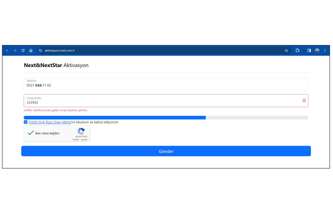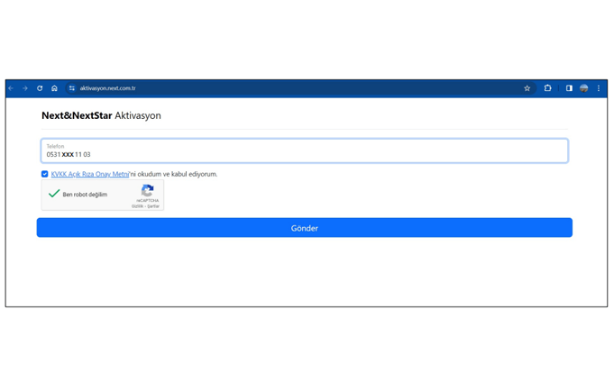 3- Açılan sayfada cep numaranızı "0" ile başlayarak girmeniz gerekmektedir. Kutucukların bilgilerini okuyarak onaylayın. Girilen numara doğru ise "Gönder" butonunu onaylayın ve işleminize devam ediniz.